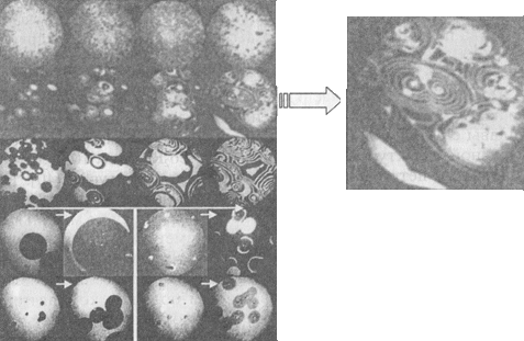Более сложные примеры нетривиального динамического поведения открытых неидеальных систем дают модельные реакции гетерогенного катализа на определенных гранях монокристаллов благородных металлов (Pt(111), Pt(100), Pt(110), Pt(210), Pd(111), Pd(110)) при низких парциальных давлениях в газовой фазе. Это реакции окисления монооксида углерода (СО) кислородом (О>2>), а также редукция монооксида азота (NO) водородом (Н>2>), аммиаком (NH>3> ) и монооксидом углерода. Перечисленные реакции играют существенную роль в экологической проблеме дожигания ядовитых выбросов (NO, CO и др.) двигателей внутреннего сгорания и тепловых электростанций. Исследования, выполненные в последние годы [42-50], открыли восхитительную нано- и мезодинамику этих систем. Обнаружены фазовые переходы типа порядок-беспорядок, сопровождающиеся образованием сверхструктур в монослое адсорбата, фазовые переходы типа расслоения на фазы, спонтанная и индуцированная адсорбатом реконструкция поверхности граней монокристаллов, коррозия катализатора. Процессы пространственно-временной самоорганизации, протекающие в нанометровой шкале размеров, тесно связаны с аналогичными явлениями, наблюдающимися с помощью эмиссионной фотоэлектронной микроскопии в микрометровом диапазоне. К таким явлениям относятся микрометровые спиральные, стоячие и триггерные 0олны, двойная метастабильность, химическая турбулентность. На рис, 11 представлены результаты исследования пространственно-временной самоорганизации в реакции окисления монооксида углерода на грани монокристалла Pt(210) методом эмиссионной фотоэлектронной микроскопии [47]. В каждой рамке (380 х 380мm) показано пространственное распределение адсорбированных молекул СО (светлые области) и атомов кислорода (темные области) на поверхности катализатора для различных значений парциальных давлений СО и кислорода в газовой фазе при постоянной температуре поверхности. Отчетливо видны спиральные волны и автоволны фазового перехода типа расслоения на фазы, явления двойной метастабильности и т. п.