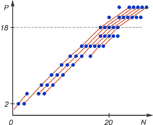 Рис. 2. График зависимости числа протонов от числа нейтронов для ядер четных элементов