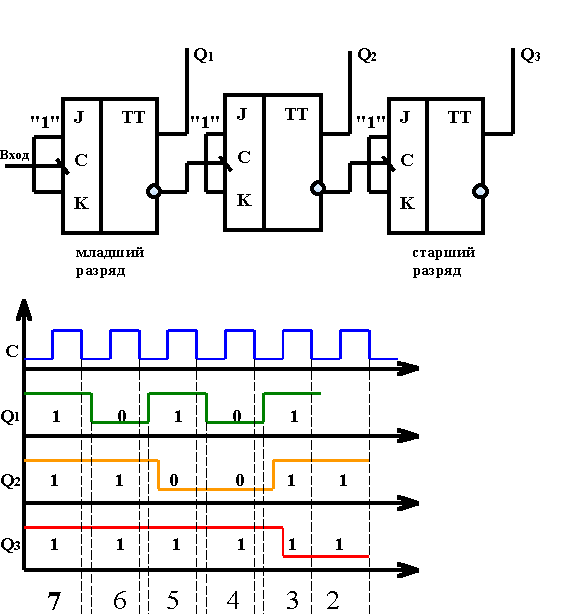 Это устройства предназначенные для подсчета числа сигналов, поступающих на его вход и фиксация этого числа в виде кода хранящегося в триггерах. Количество разрядов счетчика определяется наибольшим числом, которое должно быть получено в каждом конкретном случае. Для подсчета и выдачи результата счетчики имеют один вход и n выходов, где n-количество разрядов. В общем случае счетчик имеет 2ⁿ устойчивых состояния, включая и 0-е. Количество устойчивых состояний называется коэффициентом пересчета счетчика (М= 2ⁿ). По назначению счетчики подразделяются на: простые и реверсивные.