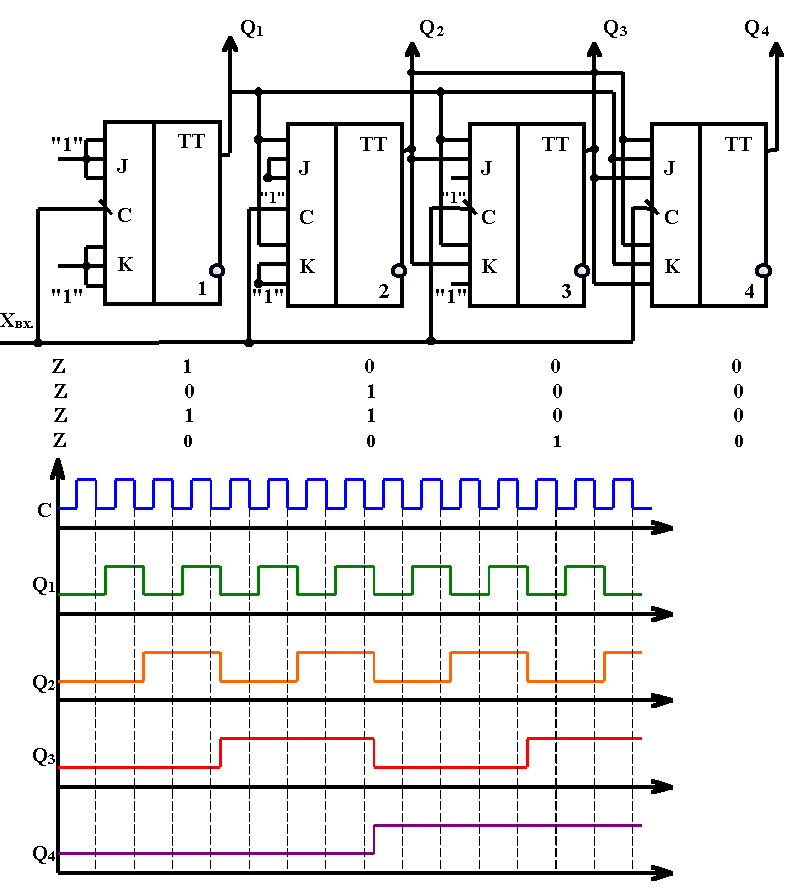 Асинхронный счетчик с последовательным переносом, работающий в режиме обратного счета.