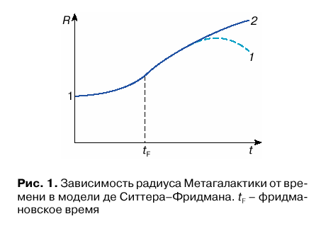 Наиболее важным в современной стандартной космологической модели Вселенной является вопрос о свойствах ранней Вселенной. Удовлетворительное описание свойств ранней Вселенной дается в модели В. де Ситтера. Более поздние промежутки эволюции Вселенной даются в модели А.А. Фридмана. Возникающая при этом зависимость размеров Вселенной от времени может быть примерно описана кривой, показанной на рис. 1. Время перехода от деситтеровской стадии расширения (1 ) к фридмановской (2 ) обозначено через t>F> . Физический смысл времени tF в том, что оно показывает момент радикального изменения закона расширения Вселенной. Переход от одного закона к другому в момент tF означает радикальное изменение основных свойств Вселенной в этот момент, изменение ее фазового состояния.