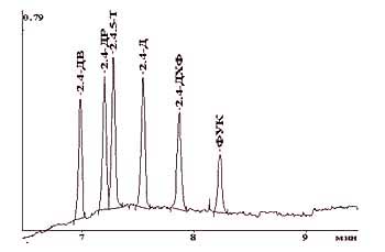В качестве разделительной системы выбрана смесь приоритетных гербицидов (кислоты: феноксиуксусная, 2,4-дихлорфеноксиуксусная (2,4-Д), 2,4,5-трихлорфеноксиуксусная, 2,4-дихлорфенокси- -пропионовая и 2,4-дихлорфенокси- -масляная) и конечного продукта их разложения (2,4-дихлорфенол). Все компоненты обладают заметным поглощением в УФ-области. Работа выполнялась на приборе "Капель-103" (НПФ АП "Люмэкс"), с кадмиевой лампой ( >раб> 228,8 нм); длина используемого кварцевого капилляра 65 см (эффективная длина- 55 см); внутренний диаметр капилляра 75 мкм.