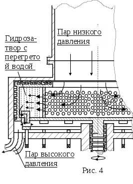 Никаких тебе конденсаторов, где выбрасывается тепло в природу! Теплота разъединения U в процессе не участвует. Правда, для совершения полезной работы надо перегревать пар. Тепловые расчеты показывают, что при хорошем перегреве и давлении, КПД цикла можно довести до 70 %.
