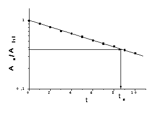 Если А>о>/А(t)=е - основанию натурального логарифма, то ln(А>о>/А(t))=1. Тогда по наклону зависимости ln(А(t)/А>о>)=f(t) легко определить время Т>2>, поскольку, в этом случае, t>е>=Т>2>, где t>е>- время, в течении которого амплитуда эхо уменьшается в е раз (рис. 2а).