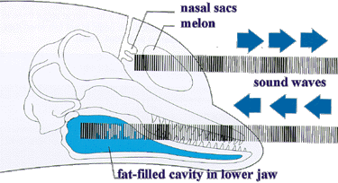 Звуковые волны дельфины посылают направленно. Жировая подушка, лежащая на челюстных и межчелюстных костях, и вогнутая передняя поверхность черепа действуют как звуковая линза и рефлектор: они концентрируют сигналы, излученные воздушными мешками, и в виде звукового пучка направляют их на лоцируемый объект.