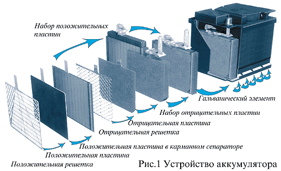 Да все то же самое, что и раньше, поскольку принципиально конструкция аккумуляторов остается неизменной с незапамятных времен: свинцовые пластины и кислота. Стандартный автомобильный аккумулятор состоит из шести 2-вольтовых элементов, что дает на выходе 12 вольт. Каждый элемент состоит из свинцовых решетчатых пластин, покрытых активным веществом и погруженных в кислотный электролит. Отрицательные пластины покрыты мелкопористым свинцом, а положительные двуокисью свинца. Когда к аккумулятору подключают нагрузку, активное вещество вступает в химическую реакцию с сернокислотным электролитом, вырабатывая электрический ток. На пластинах при этом осаждается сульфат свинца, и электролит, соответственно, истощается. При зарядке эта реакция проходит в обратном направлении, и способность аккумулятора давать ток восстанавливается.