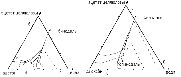 На рис.1 показаны трехфазные диаграммы (полимер/растворитель/осадитель) для обоих видов расслоения [1]. Приводятся временные зависимости коагуляционных путей для трехфазных смесей ацетат целлюлозы/ацеион/вода и ацетат целлюлозы/диоксан/вода. Как можно видеть, при использовании в качестве растворителя ацетона (рис.1а), бинодаль достигается только после времени погружения более чем 25 с. В этом случае разложение замедленное со временем запаздывания около полминуты. На рис.1б представлены коагуляционные пути для двух полимерных растворов разного состава при использовании в качестве растворителя диоксана. Как видно из рисунка, для обоих растворов бинодаль достигается сразу же после погружения, то есть имеет место мгновенное разложение.