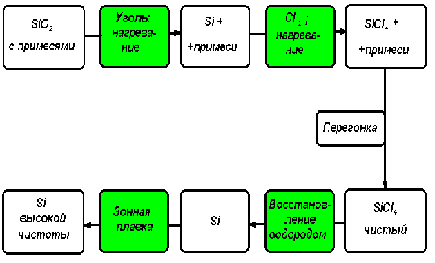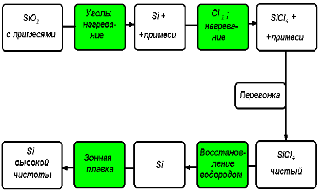 Общим методом получения кремния и германия высокой степени чистоты является метод зонной плавки. Этот метод ( схема метода зонной плавк приведена на рисунке №2)