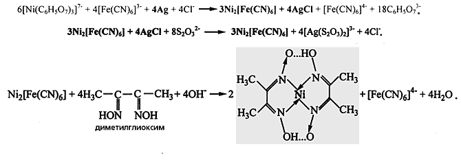 Схема реакций, приводящих к образованию хелатного соединения на основе двухвалентного никеля с диметилглиоксимом. Обработкой исходного серебряного снимка раствором, содержащим комплекс никеля с лимонной кислотой, гексацианоферрат(III)- и хлорид-анионы, элементное серебро переводится в AgCl, которое после взаимодействия с тиосульфатом натрия Na>2>S>2>O>3> превращается в растворимое соединение и вымывается из фотослоя. Оставшийся в нем гексацианоферрат никеля вступает в реакцию с диметилглиоксимом и образуется металлохелат - носитель несеребряного изображения розово-красного цвета. Соединения, остающиеся в фотослое, выделены жирным шрифтом.