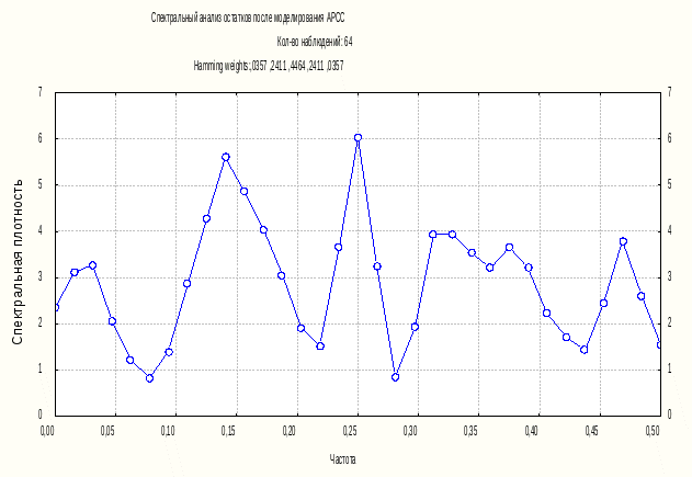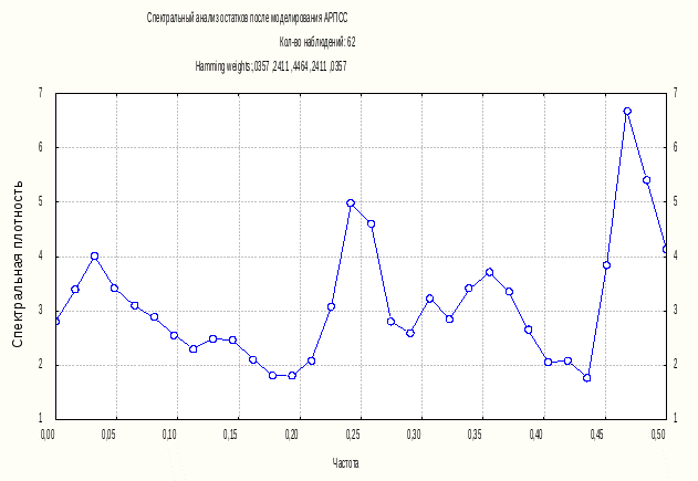 Спектр ряда, оставшегося после моделирования АРСС (рис.12) далеко не похож на спектр «белого шума». Это говорит о том, что эта модель не является адекватной.