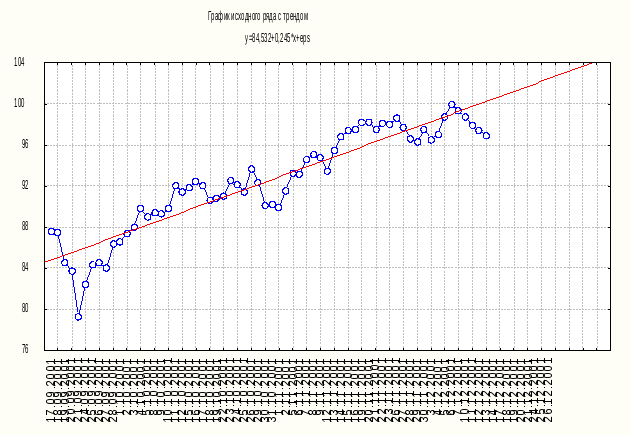 Эти данные – это низшая отметка индекса Доу Джонса на торгах. Данные взяты с интернета на период с 17 сентября по 13 декабря 2001г. Показания являются ежедневными, в неделе 5 дней торгов. Нужно будет дать прогноз на 26 декабря 2001г.