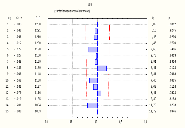 Б.) Моделирование с помощью АРПСС производится на исходном ряде. Перво-наперво нужно определить порядки p, d и q. На практике это делается на основе разностей только первого или второго порядков. Термин «проинтегрированный» означает, какого порядка нужно взять разность, чтобы получить ССП. Тогда порядком разности и будет d. p и q определяются с помощью коррелограмм ЧАКФ (рис.10) и АКФ (рис.9) ССП, полученного разностями.
