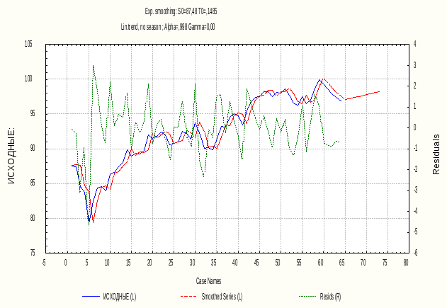 Адаптивная модель Хольта содержит чуть меньшую среднеквадратичную ошибку, чем АРПСС, но график ее прогноза, во всяком случае, не лучше совпадает с общей динамикой, показывая менее крутой подъем индекса, чем на протяжении всего ряда.