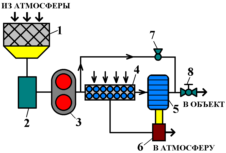 1 – фильтр; 2 – осушитель; 3 – компрессор; 4 – воздушный теплообменник; 5 – холодильник; 6 – вентилятор; 7 – клапан; 8 – кран.