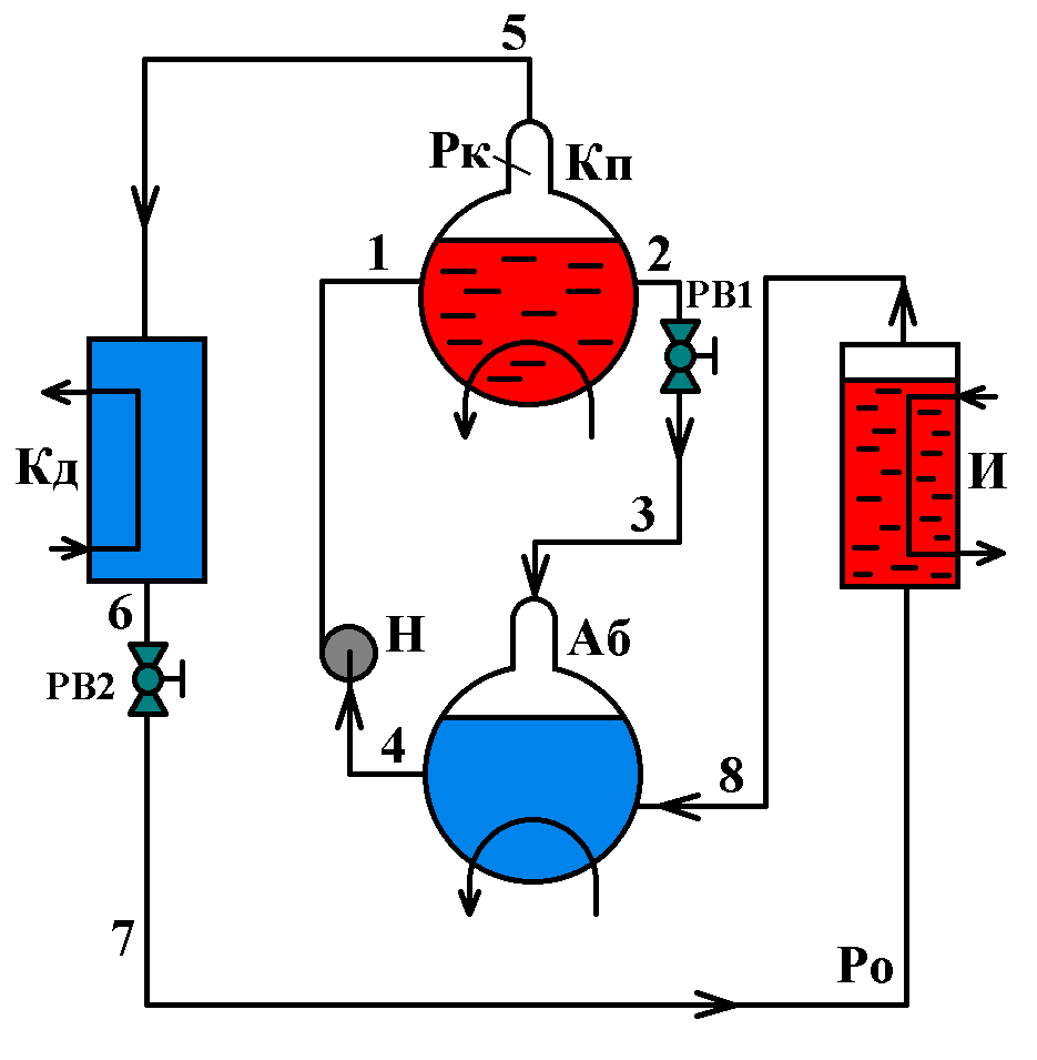 Водоаммиачный насос Н подаёт в кипятильник крепкий раствор большой концентрации r при давлении конденсации Рк и температуре t1. Значительная часть образующихся в кипятильнике паров аммиака при температуре t5 поступает в конденсатор Кд, в котором вместе с парами воды сжижается. Слабый раствор концентрации а при температуре t2 дросселируется в регулирующем вентиле РВ1 до давления кипения Ро и температуры t3, затем направляется в абсорбер Аб, где абсорбируются пары, поступающие из испарителя И. Тепло абсорбции отводится охлаждающей водой.