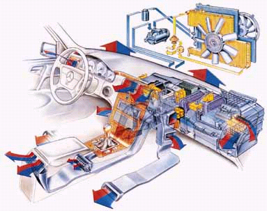 Блок-связка водяной отопитель — вентилятор многие десятилетия выступала в роли основной климатической установки в автомобиле. Постепенно совершенствовались системы регулирования температуры, смешивания и распределения горячего и холодного воздуха. Появились автомобили, где тепло подавалось в зону под задними сидениями, приятно согревая ноги пассажиров. Дальнейшие технические усовершенствования позволили горячий воздух направлять понизу салона (к ногам), теплый — примерно посередине (на уровень пояса и груди ), а холодный — наверх (к лицу). Трехслойное — по высоте — распределение теплого воздуха привело к значительному усложнению приборов управления отопителя. Запросы потребителей с каждым годом становились все разнообразнее и изощреннее. Поэтому сейчас во многих новых моделях водитель и пассажиры могут независимо, каждый по своему вкусу, регулировать температуру потока воздуха и некоторые другие характеристики.