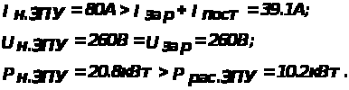По полученным в процессе расчета напряжению, току и мощности принимаем зарядно-подзарядный агрегат типа ВАЗН-380/260-40/80. Технические данные которого удовлетворяют условиям выбора: