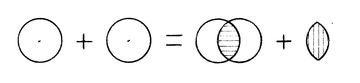 Иными словами, потеряв значительную часть своих фотонов, атомы не могут удалиться друг от друга вследствие наличия общих фотонов. Именно поэтому молекула обладает прочностью и не может самопроизвольно распасться на атомы. Но если ее нагреть, тогда атомы поглотят теплоту в количестве, равном 104 килокалориям, объем атомов увеличится до естественного состояния, вследствие чего сильно уменьшится их межъядерное притяжение и молекула просто перестанет существовать, распавшись на атомы [5]. Этот принцип взаимодействия частиц и образования структур действует на любом уровне усложнения материи. Например, если в левую часть уравнения реакции вместо окружностей подставить электрон и позитрон, то в правой части получим фотон и нейтринную материю, как энергию образования фотона: