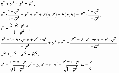 Анизотропия (20) движущейся системы, является следствием вполне определенной деформации линеек этой системы. Поэтому, является разумным и методически правильным, сначала найти такую деформацию линеек движущегося наблюдателя, чтобы он, производя одновременные измерения, мог видеть световую сферу (обеспечивая тем самым выполнение требования однородности времени), а только потом измерять координаты этой сферы. Таким образом, задача о поиске преобразований координат, решение которой очевидно, исходя из (10) и (11), переходит в задачу о деформации меры пространственных характеристик (в данном случае линеек) движущейся системы отсчета.