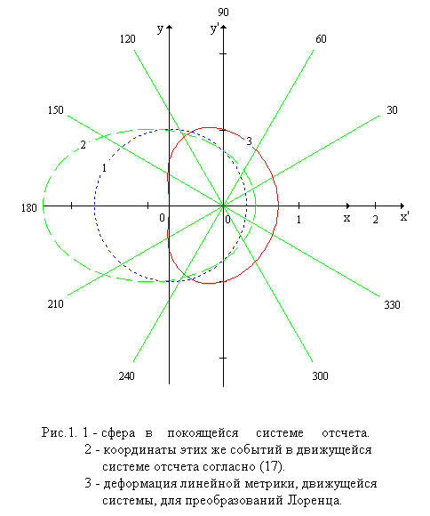 Из рис.1 видно, что координаты событий, даваемые формулой (17) ложатся не на сферу, а на поверхность эллипса. На основании этого можно заключить, что вывод Эйнштейна о сферичности получаемых результатов, для движущейся системы отсчета, сделан неверно. Преобразования (1) не удовлетворяют пункту 1 исходных требований поставленной задачи. Не смотря на то, что уравнения в цитате его работы совпадают по форме, они несут различное содержание. В первом уравнении цитаты координаты событий определяются только промежутком времени, который прошел с момента вспышки - это сфера. Переменные второго уравнения цитаты, т.е. координаты и промежуток времени, измеряемые наблюдателем движущейся системы отсчета, несамостоятельны. Они, посредством преобразований Лоренца, однозначно определяются переменными первого уравнения цитаты. Однако полученный эллипс не является нонсенсом для СТО. Более того, он находится в полном согласии с выводами СТО о сокращении стержней и не одновременности. Покажем это, выстроив логику покоящегося наблюдателя, проверяя тем самым пункт 2 исходных требований задачи.