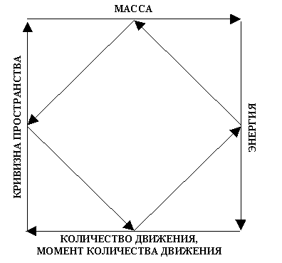 Для рассматриваемого случая приложения теории АМП важна не только неевклидовость мирового пространства, но и предсказываемая диаграммой (рис.1) возможность эквивалентных переходов энергии в кривизну пространства, в частности, перехода количества движения или момента количества движения (МКД) в кривизну пространства (показанного на рисунке стрелками). О возможности обратного перехода “кривизна пространства – момент количества движения” речь шла в других статьях автора [5,6].