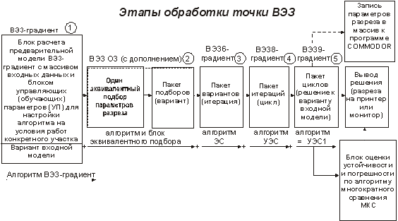 При этом система связей блока ВЭЗ ОЗ была известна автору лишь схематически. Этот блок ВЭЗ ОЗ и стал первой программной оболочкой будущего пакета. Но вначале автором был разработан блок расчёта предварительной модели геоэлектрического разреза ВЭЗ-градиент в режиме автомата-полуавтомата на основе способа особых точек (алгоритм ВЭЗ-градиент) [10]. Блок ВЭЗ-градиент (см. рисунок) может работать и автономно. По объёму он превышает блок ВЭЗ ОЗ и практически является управляющим блоком всей системы. Затем блок подбора и блок ВЭЗ-градиент встраивались в оболочку эквивалентной стабилизации (ЭС) с весьма основательным дополнением в подпрограмму эквивалентной оптимизации "OPT" (системы ограничений параметров режиме автомата-полуавтомата с увеличением объёма в подпрограмме "OPT" в 1,5 раза). Другая подпрограмма "TEKCT", была увеличена по объёму в 3,5 раза и т.д.