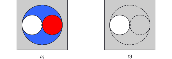 На рис. 7а показаны две полости равного радиуса R, находящиеся в однородном изотропном пространстве. Плотность вещества, равномерно заполняющего пространство, примем равным ρ. Плотность вещества внутри каждой полости первоначально примем равной нулю.