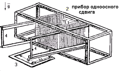 Рядом авторов в приборе однородного сдвига обнаружена качественная перестройка песчаной среды [4]. Прибор представлял собой камеру 1, установленную в жесткой раме 2 (рис.1). Элементы жесткой рамы служили направляющими при сдвиге камеры. Камера (внутренние размеры 150 ´ 150 ´ 150 мм) была набрана из 30 П-образных пластин 3, изготовленных из оргстекла. Форма пластин позволяла наблюдать кинематику деформирования с трех граней камеры через стекла, которыми закрывались эти грани. Величина сдвига определялась соответствующим поворотом ручек 4 и измерялась по угловой шкале. Объем камеры сохранялся постоянным при любых сдвигах. Так как толщина пластин в 30 раз меньше длины камеры, то при любой деформации сдвига относительное смещение пластин было незначительным (до 2 мм при Г < 20° ). Последнее исключало трение материала о стенки камеры, а также обеспечивало достаточную однородность всех граничных условий. Очевидно также то, что для однородности процессов в плоскости сдвига необходимо, чтобы сила тяжести была направлена к ней по нормали.
