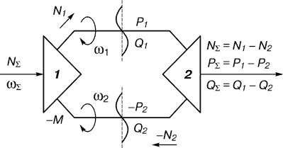 Рис. 3. Схема циркуляции мощности в двухступенчатом вентиляторе с дифференциальным движителем при установке лопастей второй ступени на «турбинный» режим.