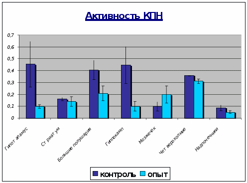 б) активность КПН уменьшается во всех пробах: в гипоталамусе в 4.5 раза, а в больших полушариях и четверохолмии в 1.5раза.
