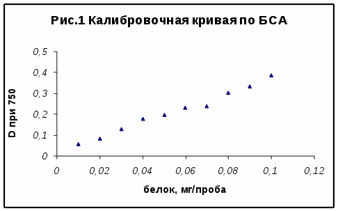 Калибровочную кривую строили по раствору бычьего сывороточного альбумина (БСА). Для этого из исходного р-ра БСА (100мкг/мл) готовили разведения с концентрацией БСА 10, 20, 30, 40, 50, 60, 70, 80, 90мкг/мл и определяли в них концентрацию белка по обычной схеме. График зависимости оптической плотности от концентрации белка приведен на рис.1.