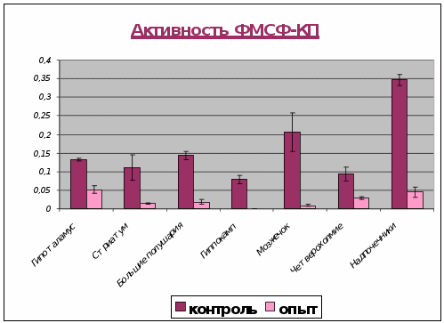 а) активность ФМСФ-КП падает в стреатуме, больших полушариях и надпочечниках в 7раз, а в гипоталамусе и четверохолмии в 3раза. Лишь в гипофизе наблюдается небольшое увеличение активности фермента в 2раза;