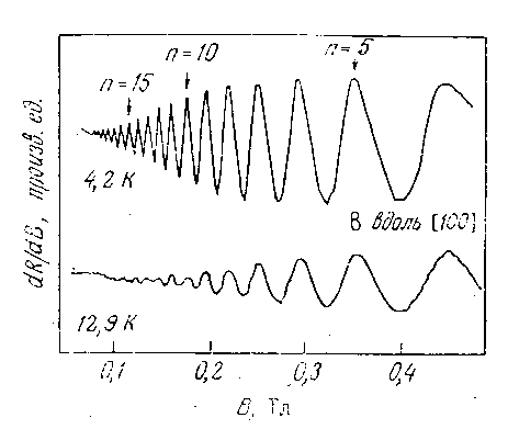 Для успешного наблюдения резонансных явлений следует работать с чистым совершенным монокристаллом при низких температурах, чтобы средняя длина свободного пробега была велика по сравнению с размером циклотронной орбиты. Поверхность, на которую падает высокочастотное излучение, должна быть хорошего качества, чтобы значение l в приповерхностном слое было таким же, как в объеме. В этих условиях значение l будет большим по сравнению с толщиной скин-слоя d и движущийся по окружности электрон будет взаимодействовать с высокочастотным полем только в течение малой доли своего периода обращения. Азбель и Канер указали, что при l>d и (w>c>t>m>) » 1 взаимодействие между высокочастотным полем и циклотронным движением может быть обеспечено как при w=w>с>, так и при значении w, достаточно малом кратном w>с>. Пусть B>c> - магнитная индукция, при которой w=w>с>. Для магнитной индукции, составляющей целую долю от B>c>, интервал между двумя последовательными попаданиями данного электрона в поверхностный слой равен нескольким периода высокочастотного поля. Однако и в этом случае высокочастотное поле сможет повторить свое воздействие на электрон в тот момент, когда он снова окажется у поверхности.