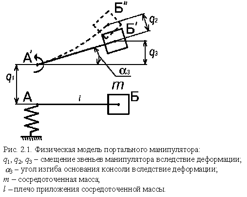 Для решения задачи выбора оптимальной скорости перемещения звеньев манипулятора с шаговым двигателем, с целью увеличения его быстродействия, необходимо учитывать переходные процессы возникающие при позиционировании рабочих органов. Переходные процессы в виде затухающих механических колебаний возникают под действием инерционных нагрузок и приводят к увеличению времени позиционирования при выполнении переходов технологического процесса, например, при сборке, сверлении, контроле и др. Для планирования траектории необходимо знать время затухания колебаний до значения допустимой погрешности позиционирования, при котором рабочий орган манипулятора может продолжать движение. С целью определения времени такого переходного процесса создана модель манипулятора портального типа с консольной подвижной частью.