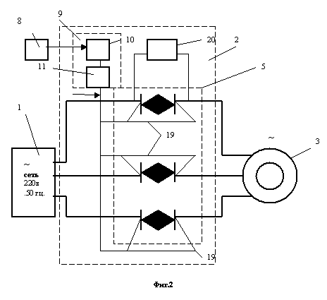 Датчик напряжения 12 и датчик тока 13 присоединены через соответствующие формирователи 14, 15 на входы логической схемы 16 типа “И – НЕ” соответствующий интервалам знакопостоянства напряжения и тока, выход которой присоединён к системе формирования управляющих импульсов 11, содержащей регулятор скважности 17, например, одновибратор, и формирователь импульсов 18, например, типа генератора Ройера, на входы управления силовых вентилей 19 регулятора напряжения 2 зашунтированных встречно включёнными стабилитронами 20.