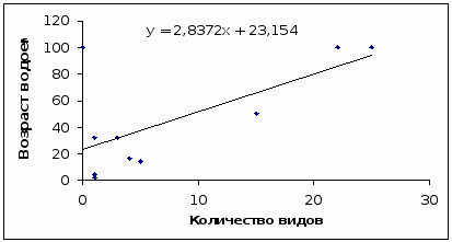 Для определения зависимости между числом видов моллюсков и возрастом водоема использовали следующий прием. Поскольку возраст рек установить невозможно, мы приняли их условный возраст за 100 лет. Возраст всех остальных водоемов нам известен. Расчет показал, что между разнообразием моллюсков и возрастом водоема существует положительная достоверная связь (n = 9, R = 0.778, P = 0.01) (Рис. 2). Результат был тем же, если возраст рек принимали за 500 и 1000 лет