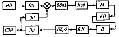 На рис. 2 дана функциональная схема прибора, на которой указаны: исследуемый объект ИО; первичный преобразователь П1; устройство сравнения УС; устройство обработки сигналов Об. 1, в котором производится селекция, усиление, коррекция погрешностей, фильтрация и др.; кодирующее устройство Код; модулятор М; канал передачи КП; устройство детектирования Д; устройство декодирования ДК; устройство обработки информации Oбр. 2, обеспечивающее функциональное преобразование, коррекции погрешностей, формирование функции преобразования (1) и др.; преобразователь Пр, выдающий информацию на систему отображения СОИ и на обратный преобразователь 0П, с которого поступают сигналы на устройство сравнения. Эта схема является обобщенной и включает ряд элементов, которые в более простых приборах могут отсутствовать.