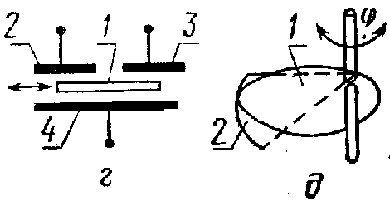 Рассматриваемая схема может быть использована в приборах уравновешивания. Для этого усиленный сигнал с конденсатора после фазочувствительного детектирования может быть подан на обкладки 1 и 2, вследствие чего на средний электрод будет действовать электростатическая сила, уравновешивающая измеряемую силу. На Рис. 11, г и д показаны схемы устройства емкостных преобразователей с переменной площадью. В схеме на Рис. 11, г диэлектрик 1 перемещается по стрелке, а в схеме на Рис. 11, д один из электродов 2 жестко связан с валом и совершает угловые перемещения относительно неподвижного электрода 1.