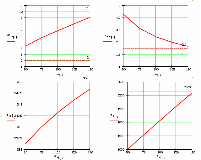 При m = 1 и q>v> = 100 получено, что данный пример не удовлетворяет условию экономичности n = 2.477 (1.6 < n < 2.2) и незначительно условию надёжности t>об> = 351.7 oC (t>об> < 350 oC).