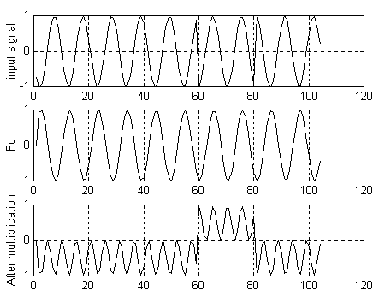 Затем сигнал идет на блоки умножения, на которые также подается с опорного кварцевого термостатированного генератора . Сигналов два, они сдвинуты по фазе относительно друг друга на 180 градусов. Это необходимо для последующего сравнения. Итак, цепь разветвилась. После умножения получается сигнал, изображенный на диаграмме. (моделирование в Matlab 4.2c)