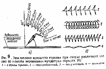 В процессе сварки газосварщик концом мундштука горелки совершает одновременно два движения: поперечное (перпендикулярно оси шва) и продольное (вдоль оси шва) (рис. 9) Основным является продольное движение. Поперечное движение служит для равномерного прогрева кромок основного металла и получения шва необходимой ширины.