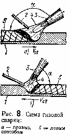 В практике применяют два способа сварки - правый и левый (см. рис.8) При правом способе сварку ведут слева на право, сварочное пламя направляют на сваренный участок шва, а присадочную проволоку перемещают вслед за горелкой. Так как при правом способе пламя направлено на сваренный шов, то обеспечивается лучшая защита сварочной ванны от кислорода и азота воздуха, большая глубина плавления, замедленное охлаждение металла шва в процессе кристаллизации. Теплота пламени рассеивается меньше, чем при левом способе, поэтому угол разделки кромок делается не 90 °, а 60-70°, что уменьшает количество наплавленного металла и коробление. При правом способе производительность на 20-25 %выше, а расход газов на 15-20 % меньше, чем при левом. Правый способ целесообразно применять при сварке металла толщиной боле 5 мм и металлов с большой теплопроводностью.