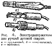 Основным рабочим инструментом сварщика при ручной сварке служит электрододержатель, который предназначен для зажима электрода и провода сварочного тока. Применяют электрододержатели пружинного, пластинчатого и винтового типов (рис. 4)