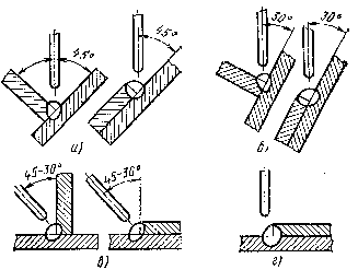 в – “в угол” наклонным электродом, г - с оплавлением кромок.