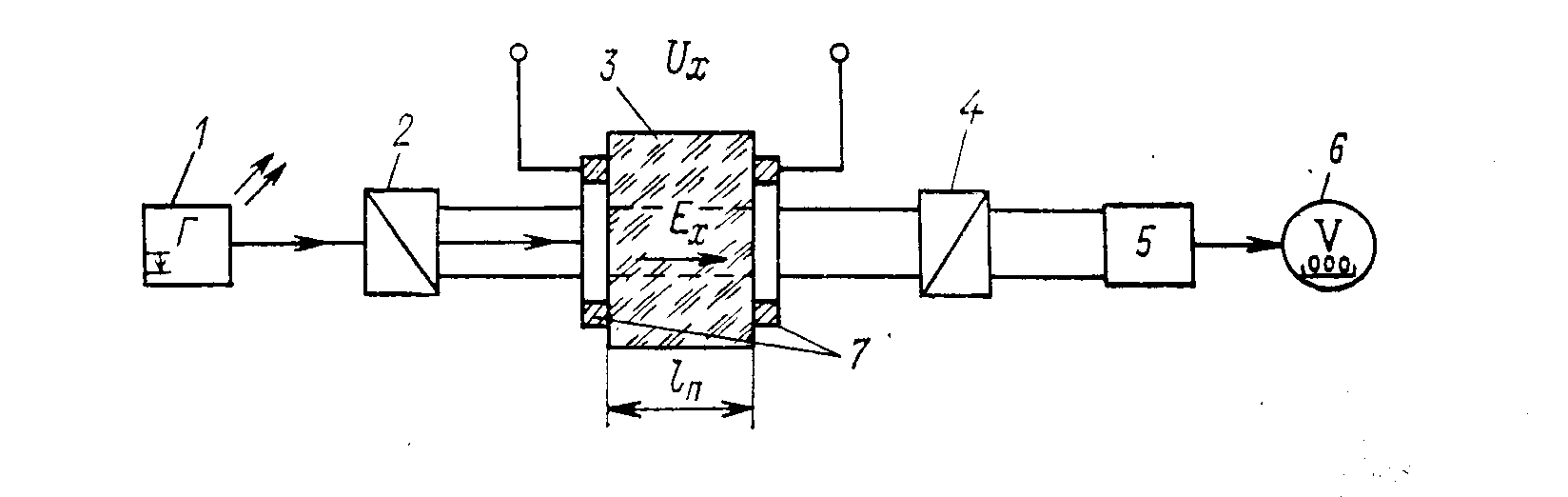 Линейный электрооптический эффект Поккельса наблюдается в пьезоэлектрических кристаллах, находящихся в электрическом поле. В зависимости от направления вектора напряженности электрического поля возникает продольный или поперечный эффект Поккельса. Продольный эффект сильнее всего проявляется в кристаллах дигидрофосфата аммония NH>4>H>2>PO>4> или гидрофосфата калия KH>2>PO>4>, где электрическое поле создается при помощи кольцевых электродов 7, к которым приложено измеряемое напряжение U>X> (рис. 4, б). Поперечный эффект сильно проявляется в кристаллах ниобата лития LiNbO>3>, которые используются в электрооптических модуляторах света.