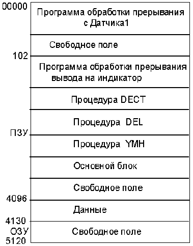В данной схеме сигнал прерывания с Датчика1 подается на вход немаскируемого прерывания INT микропроцессора Z-80. В общем случае обычное прерывание приведет к тому, что текущий счетчик команд будет помещен в стек, а управление с помощью программы RST будет передано на нулевую страницу ПЗУ. Поэтому процедура обработки прерываний должна находится по адресу 0000Н (см. рис. 5). Сигнал прерывания с таймера, контролирующий вывод на индикатор, поступает на вход немаскируемого прерывания NMI. Это прерывание имеет более высокий приоритет чем INT. Сигнал автоматически переводит ЦП к выполнению программы с адреса 0066Н. Поэтому данная процедура обработки прерывания вывода на индикатор должна находится по этому адресу. Следом за ней идут вспомогательные процедуры DECT, DEL, YMH, после чего располагается основная программа.