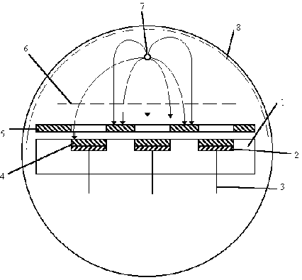 1 - плата; 2, 8 - проводящие слои; 3 - вывод; 4 - люминофор; 5 - экранирующий электрод; 6 - сетка; 7 - катод.