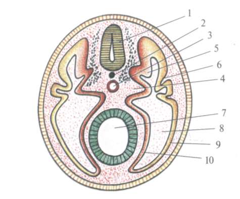 Часть клеток мезодермы в пределах первичного узелка особенно активно растет вперед от головного и хвостового конца зародыша, проникает между наружным и внутренним листками и образует клеточный тяж - спинную струну (хорду). В конце 3-й недели развития в передней части наружного зародышевого листка происходит активный рост клеток - образуется нервная пластинка. Эта пластинка вскоре прогибается, образуя продольную борозду - нервную бороздку. Края бороздки утолщаются, сближаются и срастаются друг с другом, замыкая нервную бороздку в нервную трубку. В дальнейшем из нервной трубки развивается вся нервная система. Эктодерма смыкается над образовавшейся нервной трубкой и теряет с ней связь.