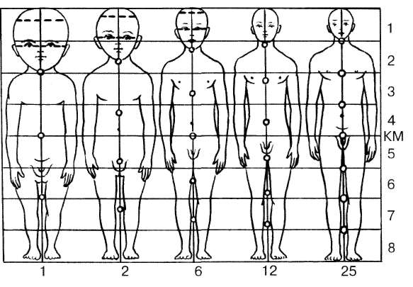 Пропорции тела зависят от возраста и пола человека (рис.4). Длина тела и ее возрастные изменения, как правило, индивидуальны. Так, например, различия в длине тела новорожденных при нормальной по срокам беременности лежат в пределах 49-54 см. Наибольший прирост длины тела детей наблюдается на первом году жизни и составляет в среднем 23,5 см. В период от 1 до 10 лет этот показатель постепенно уменьшается в среднем на 10,5 - 5 см в год. С 9-летнего возраста начинают появляться половые различия в скорости роста. Масса тела с первых дней жизни и примерно до 25 лет у большинства людей постепенно увеличивается, а затем остается без изменений.