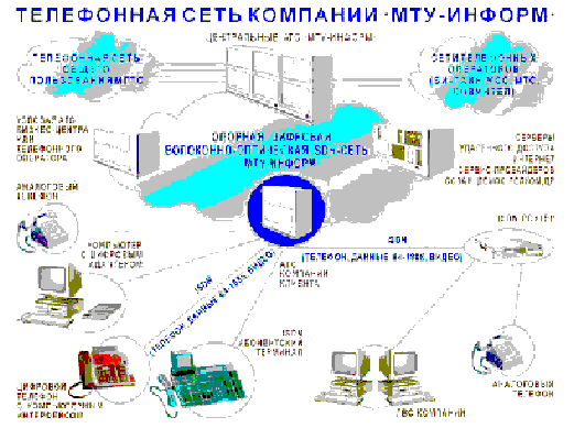 Телефонная сеть компании "МТУ-Информ" предназначена для оказания разнообразных телефонных услуг индивидуальным и корпоративным клиентам г. Москвы. Сеть базируется на принадлежащих компании электронных цифровых АТС, а в качестве транспортной среды используется Error: Reference source not found. Номерная емкость составляет в настоящее время примерно 100000 номеров, входящих в нумерацию Московской городской телефонной сети. Таким образом, по числу обслуживаемых абонентов компания "МТУ-Информ" является вторым после АО "МГТС" оператором телефонной связи в Москве. Телефонные услуги, предоставляемые "МТУ-Информ", отличает высокое качество. Его составляющие — хорошая слышимость, надежность установления соединения, стабильность параметров сигнала и т. д. Располагая собственной транспортной сетью, равномерно покрывающей практически весь город, "МТУ-Информ" имеет возможность обеспечивать связь с абонентами МГТС, доставляя сигнал к центральной АТС компании по своей цифровой сети. Устаревшие аналоговые АТС, на которых в значительной степени происходит потеря качества сигнала, при этом не используются. Центральный узел сети "МТУ-Информ" имеет выходы на другие города и за пределы России через СП "СЦС Совинтел" и АО "Ростелеком". Благодаря высоким характеристикам телефонной сети "МТУ-Информ" ее услугами пользуются: